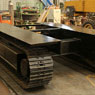 履带板采用高单齿板,抓地力强,增加与地面的摩擦,接地比压小,提高了爬坡能力和行走的稳定性,行走液压马达采用前置安装,减小了导向轮在上坡时对张紧机构的负荷,提高了使提高了使用寿命。